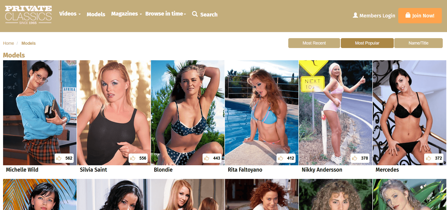 Private Classics review includes a model index with glamour portraits and biographical highlights. Profiles include: